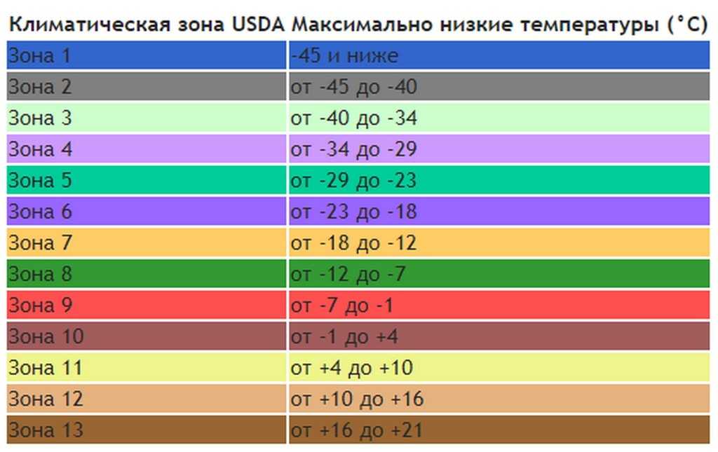 Порядок перечисления зон зимостойкости напрямую связан с температурой. Наиболее суровой по климатическим условиям является нулевая (морозы ниже -51оС). Зоной с наиболее мягкими климатическими условиями является двенадцатая: здесь даже зимой температура не опускается ниже +10оС.