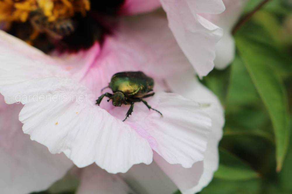 Жук-бронзовка — насекомое с красивой золотисто-желто-зеленой окраской панциря. Летает жук с мая и до конца августа, а опасен тем, что объедает лепестки, листья и стебли пионов.