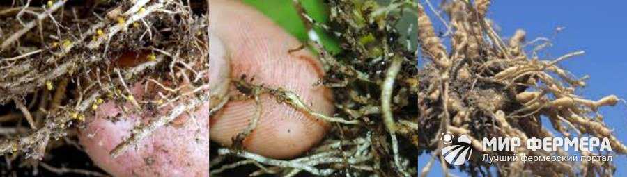 Вздутость корней и их поврежденность свидетельствует о нашествии нематод. Чтобы справиться с паразитами и избежать распространения вредителей на соседние кусты, пораженное растение выкапывается и сжигается.