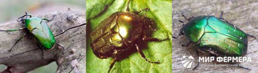 Мелкие_жучки зеленой бронзовки питаются цветами и листьями. Собирать их нужно вручную, лучше всего в утреннее время, когда их концентрация максимальна. Причем на цветах хорошо видно этих золотисто-зеленых вредителей, тогда как на листьях они могут сливаться с окружающей средой и нужно проводить осмотр внимательно.