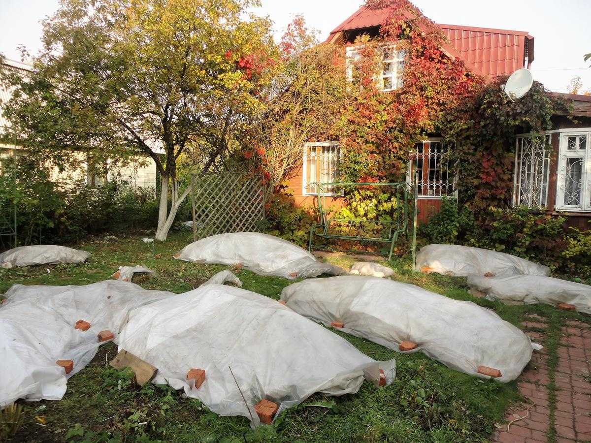 Сверху кусты накрывают полиэтиленом, лапником или другим подходящим материалом.