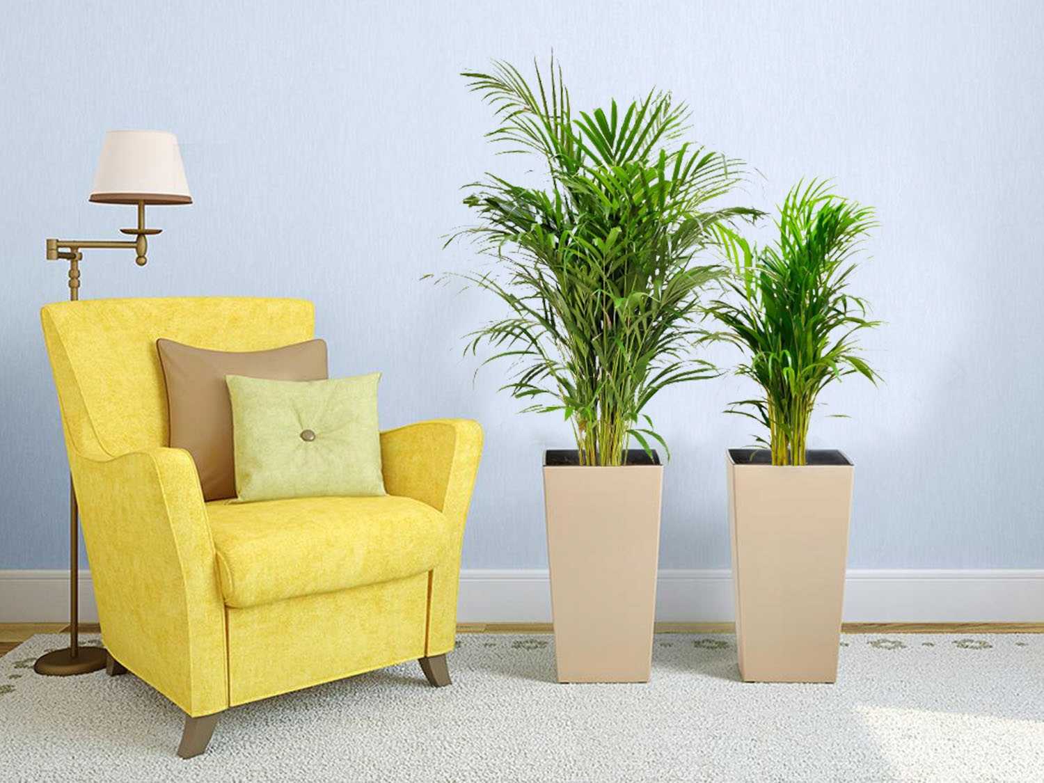 Сухой воздух в помещении способствует тому, что у пальмы желтеют листья. Необычный способ увлажнения — поставить в комнате несколько горшков с растениями.