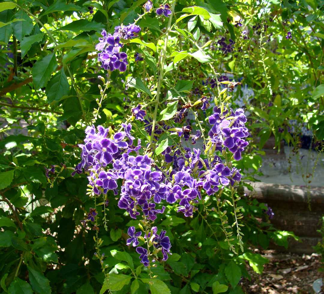 Самое прекрасное у дуранты – свисающие гроздьями соцветия. Каждый цветочек состоит из пяти симметрично расположенных лепестков, по форме они отдаленно напоминают соцветия виолы (анютины глазки). Расцветка в белых, голубых, синих, сиреневых, фиолетовых тонах. Особенно эффектны цветы темных оттенков с белоснежным окаймлением.