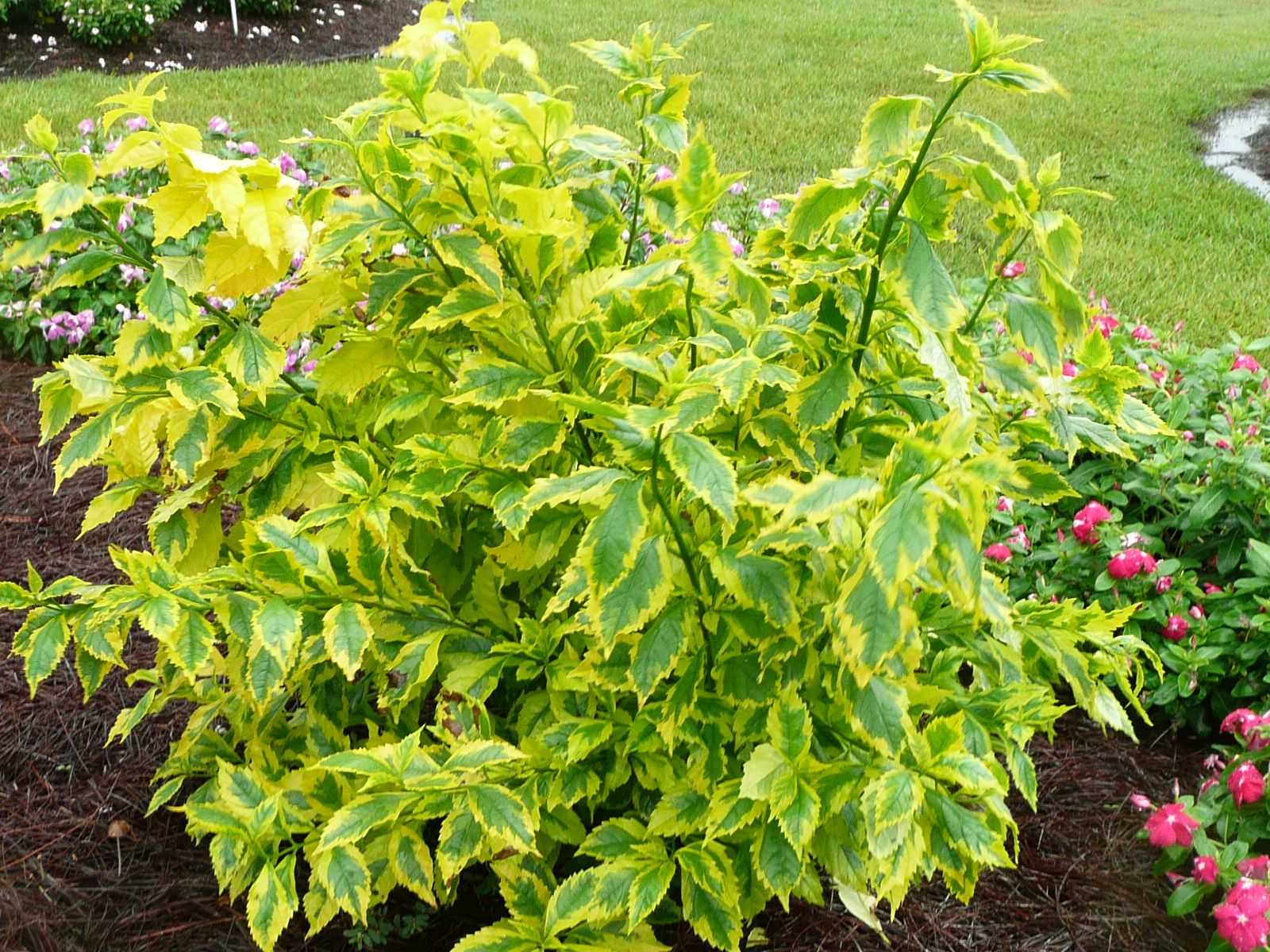 Этот сорт выделяется своей причудливой окраской листвы. На пластинах можно увидеть три цвета: темно-зеленый, лаймовый и стандартный зеленый. Первые два особенно сильно контрастируют друг с другом. Из-за этого кустарник нередко именуют «триколор». В дополнение к яркой расцветке листья имеют ярко выраженный глянцевый блеск. Цветки голубоватые, с приятным ненавязчивым ароматом.