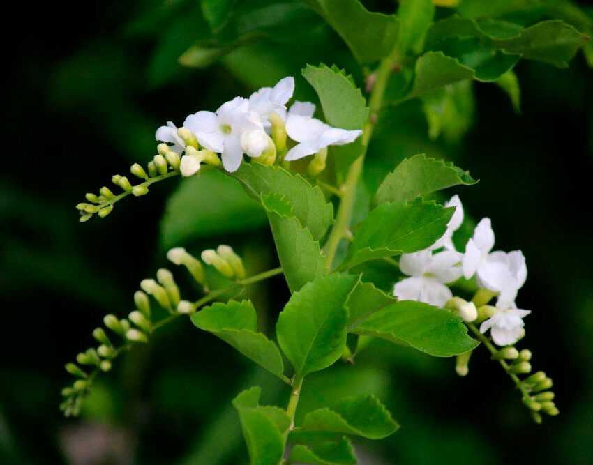 По названию легко понять, в чем отличие данной разновидности: она имеет белые лепестки. Кожистые листья светло-зеленые, с зазубринами на краях. Во время цветения появляется нежный сладковатый аромат, напоминающий ваниль. Дуранта белая может достигать до 150 см в высоту.