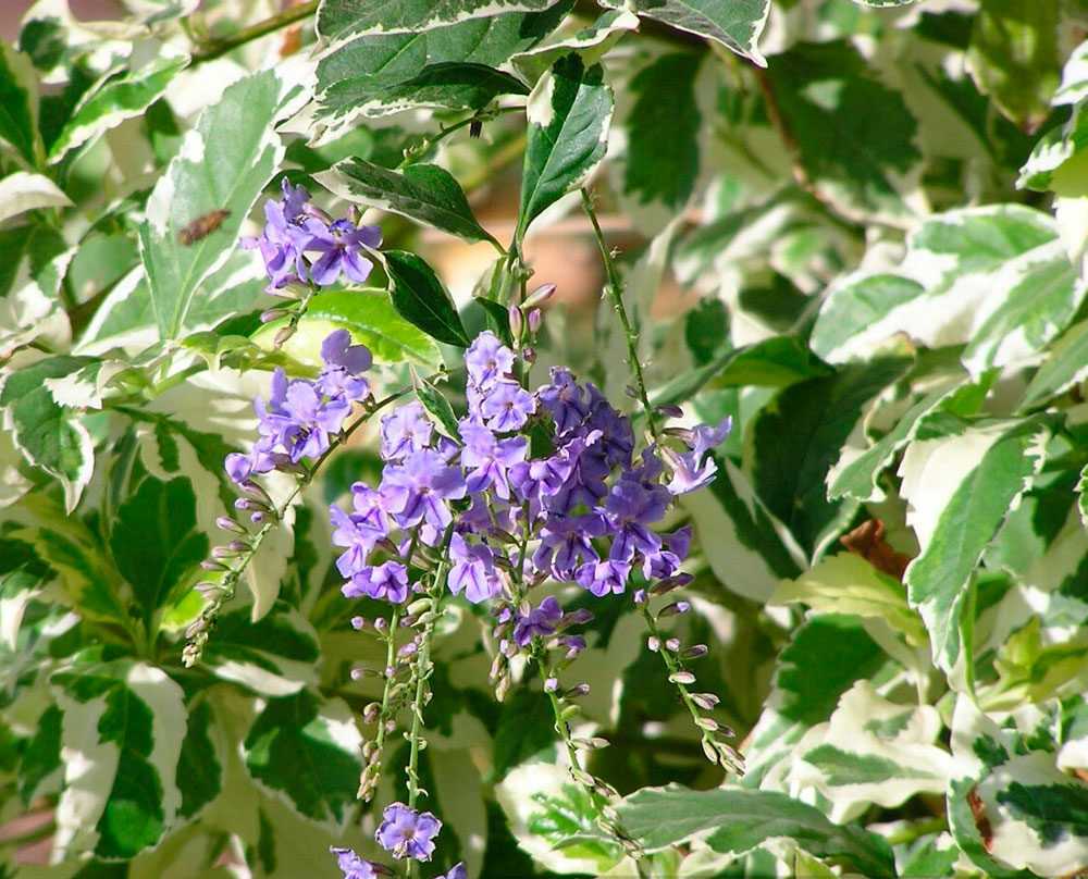 Похвастать дуранта вариегатная может не только декоративной листвой, но и уникальной окраской цветков: они обладают нежным сиреневым или голубым оттенком с темными полосами на нижних лепестках. Присутствует слабо заметная светлая кайма.