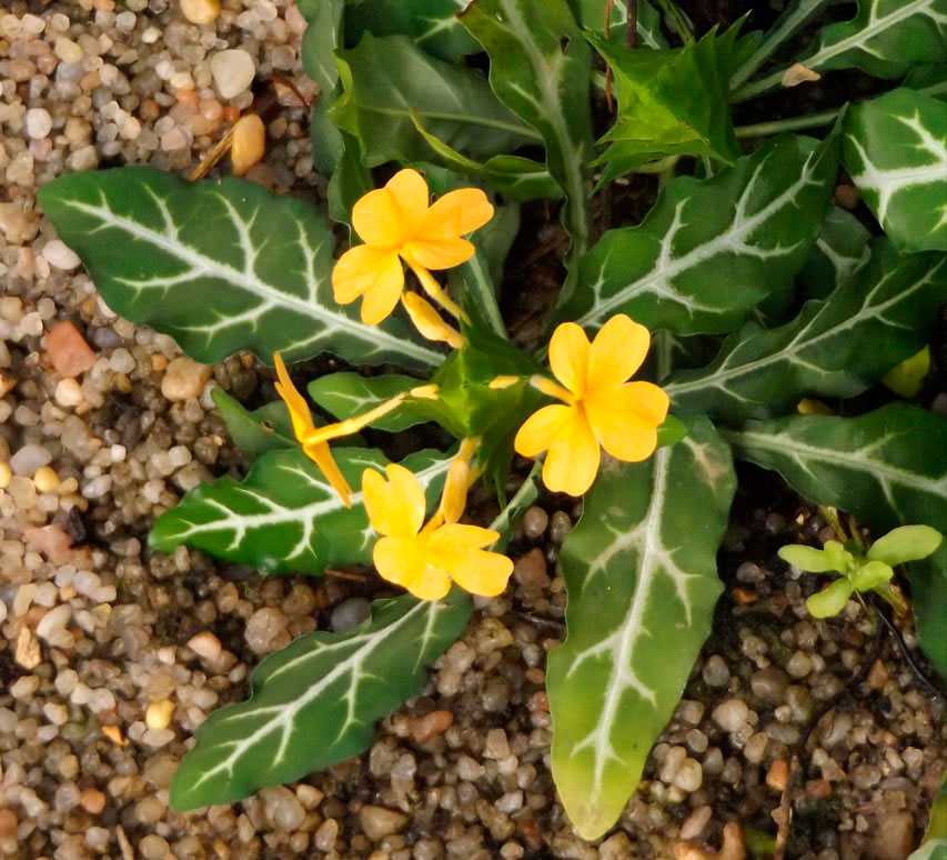 Эффектное растение высотой 40–60 см. Листья крупные, длиной до 12 см, ланцетные, темно-зеленые с серебристо-белыми жилками — центральной и крупными боковыми. Цветки желтые.