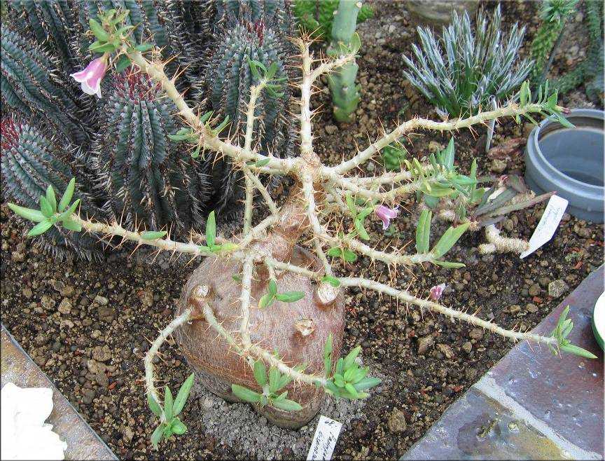 - Сочный пахиподиум (succulentum). Древесное растение, ствол до 15 см в диаметре. Большая его часть закопана в землю. На поверхности остается только сильно разветвленная «корона» высотой 60-90 см. В основании каждого листа длиной 5-6 см и шириной 1-2 см есть два коротких шипа. Цветки диаметром около 4 см бледно-розовые, центр ярко-алый.
