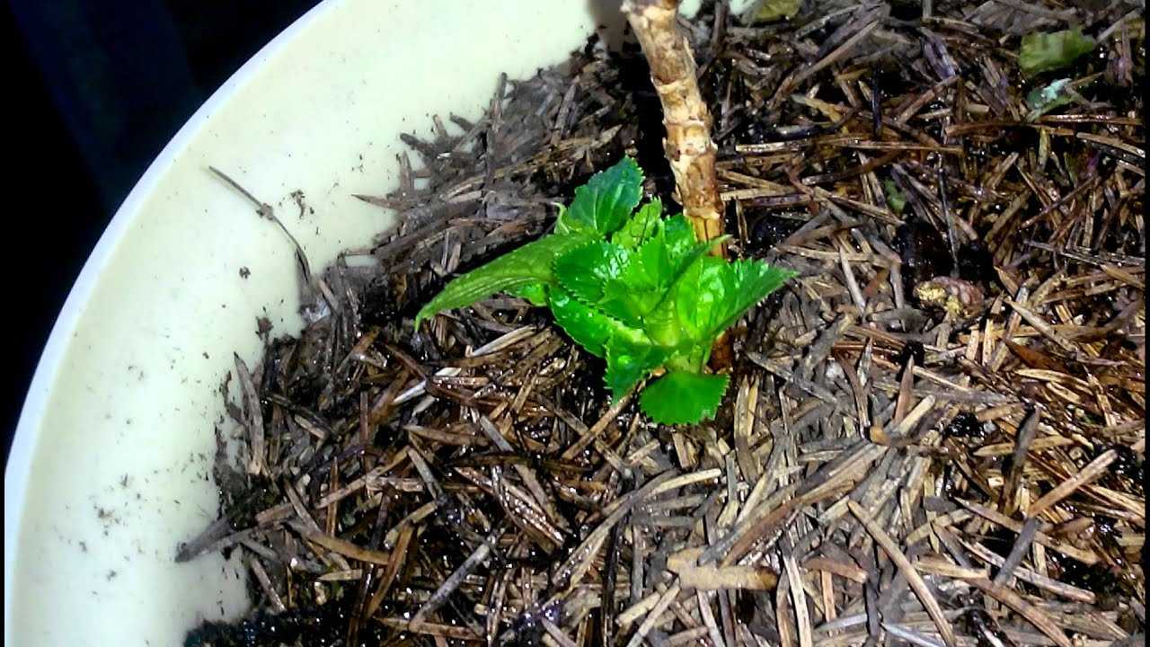 - сразу же после покупки, а затем через каждые два года гортензию следует пересаживать в ёмкость большего размера; это рекомендуется делать либо ранней весной до цветения, либо поздней осенью после окончания цветения; при этом понадобится более широкий сосуд, так как корни гортензии разрастаются вширь, а максимальная глубина корней взрослого цветка достигает 25–30 см, также при пересадке нельзя заглублять корневую шейку (место перехода цвета побега с зелёного на светло-коричневый) — она должна оставаться на уровне почвы;Каждые два года гортензию следует пересаживать в ёмкость большего размера