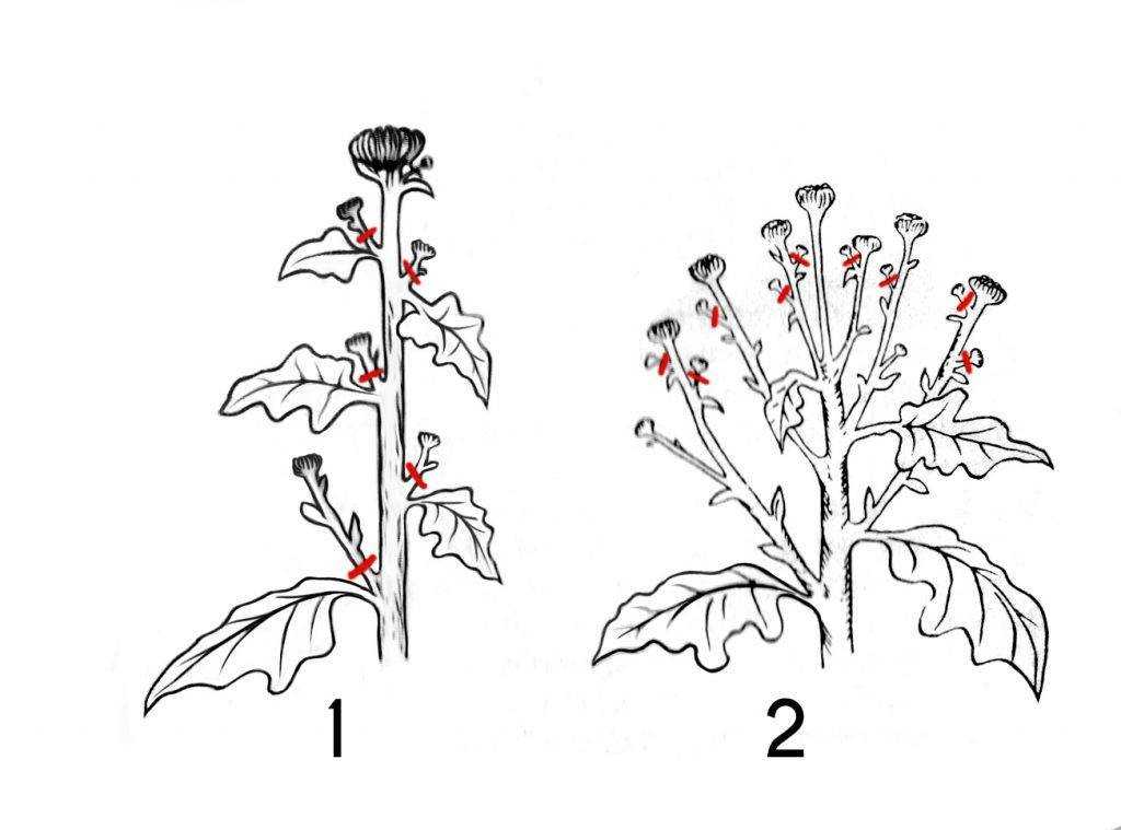 Фото: 1. Пасынкование крупноцветковых сортов хризантем; 2. Пасынкование мелкоцветковых сортов хризантем.