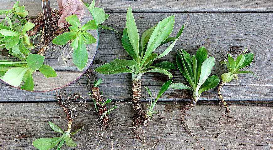 Растение, которое необходимо поделить, обильно поливают. Затем через два часа его выкапывают. Далее разбирают на розетки. У молодых видов разделение проходит проще. У старых растений приходится применять нож. У каждой части оставляется кусок корневища.