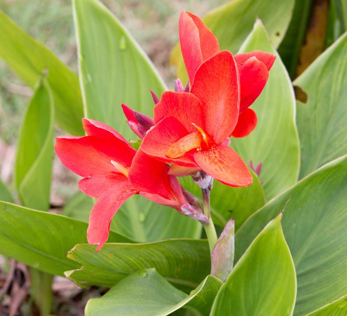 Этот статный цветок (высотой до 3 м) цветет с июня до поздней осени. Листья – крупные, эллиптические или овально-продолговатые, заостренные, (длиной 25-80 см и шириной 10-30 см), зеленые, полосатые или пурпурно-бронзовые. Цветки – красные, оранжевые, желтые, розовые или белые. Они располагаются на высоких стеблях и не увядают до заморозков. Канна совсем неприхотлива, почти не болеет и не привлекает вредных насекомых, даже если ее ничем не обрабатывать, однако в средней полосе не способна перезимовать без хорошего укрытия.