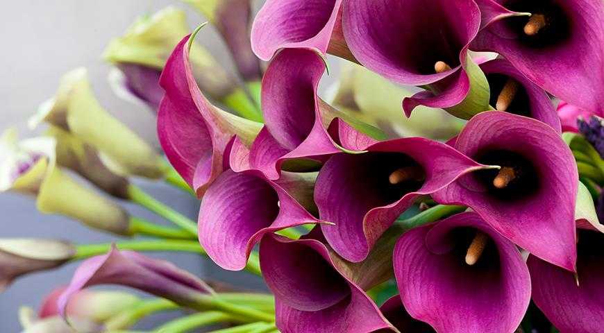 Цветки калл очень похожи на цветки антуриумов, что не удивительно, ведь оба вида принадлежат к одному семейству Ароидных. Именно из-за особенности строения цветка (а именно: красивый цветок — это не цветок вовсе, а лист прицветного покрывала, который просто защищает центральный довольно неказистый цветочек) им досталась такая стойкость. Чем дольше цветок под защитой, тем лучше и для цветка и для нас. Ведь красивые канны могут стоять в букете до 2х недель.
