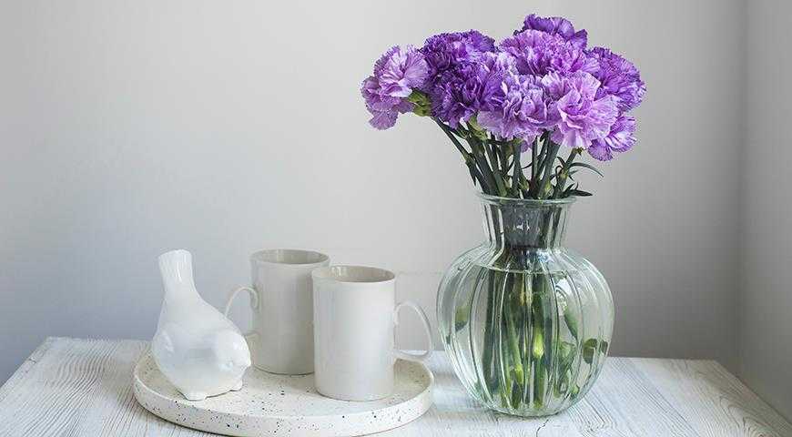 Стоят очень долго и даже без воды, но в воде дольше — от 2 до 4 недель. Благодаря своей стойкости гвоздика — прекрасный материал для интерьерных композиций.