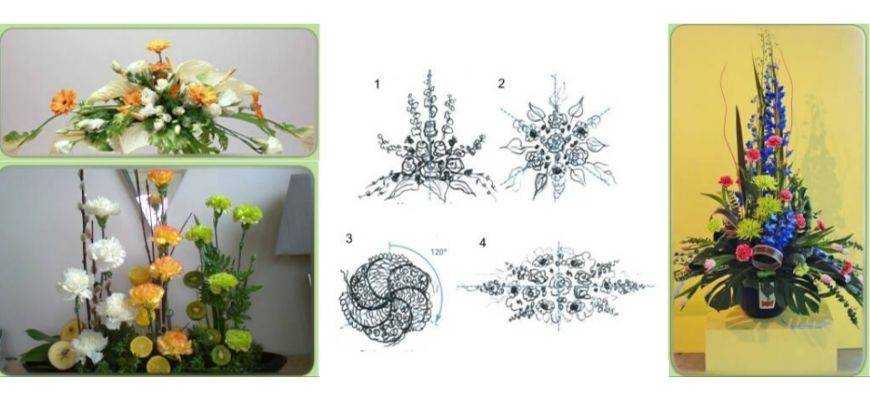 - Лучевая (2, 3) – встречается в венках, круглых композициях или с ниспадающими растениями.