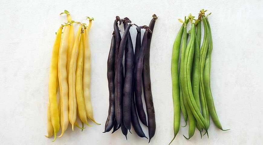 Желтые, зеленые и фиолетовые стручки стручковой фасоли