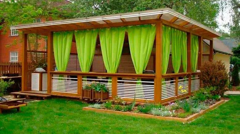 По типу конструкции беседка может быть открытой, закрытой, полуоткрытой. Постройка первого типа представляет собой навес, состоящий из опор и крыши. Полуоткрытый вариант также называют комбинированным — это традиционный вариант с перегородками и сквозными проемами, которая защищает от солнца. Закрытый тип — практически полноценная постройка с фундаментом и стенами. От выбранного типа конструкции будущего строения зависит то, какие материалы будут для него использованы.