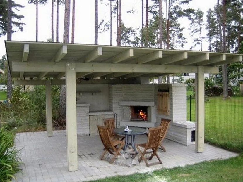 Древесина — самый популярный материал для строительства односкатных беседок. Для возведения основания используют железобетонную плиту или бетонный блок, а для крыши — доски, шифер или поликарбонат.