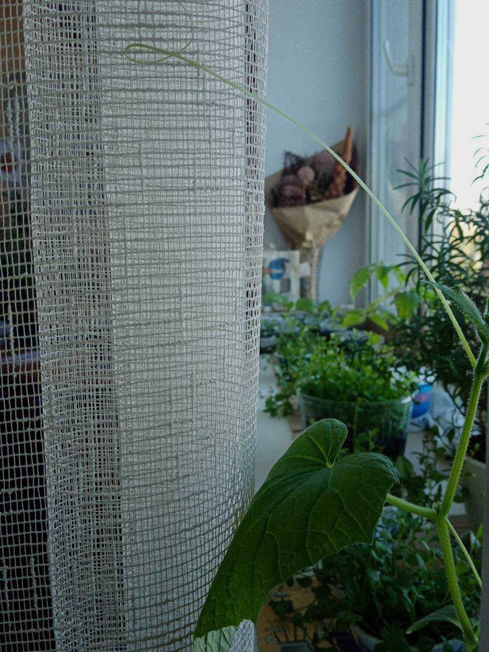 За огурцами нужен глаз да глаз. Недосмотрела за этим саженцем, и он зацепился усом за штору. Пора высаживать на участке или организовывать ему опору на окне
