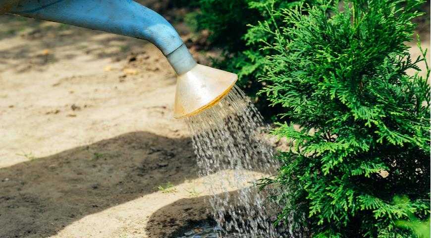 Поливать туи необходимо один раз в неделю таким же образом, как и после посадки. Каждому деревцу требуется минимум ведро воды. В особо жаркий период полив должен быть более обильным. Тогда под каждое растение нужно выливать не менее 20 литров воды.