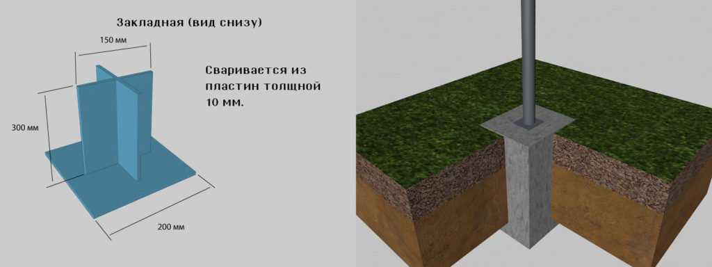 Во время подготовки основания под конструкцию в тех местах, где будут стоять опоры из профильной трубы, вынимают грунт. На дно выкопанных ям насыпают слой щебня. Потом с целью крепления стоек устанавливают закладную, на которой приварены болты. При желании дополнительно придать конструкции прочность используют арматуру.