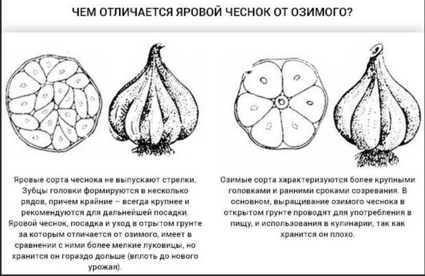 Озимый чеснок отличает более острый вкус, яровой слаще. На конце стрелки формируется «воздушная луковица», то есть мешочек с семенами. Это позволяет размножать культуру не только дольками.