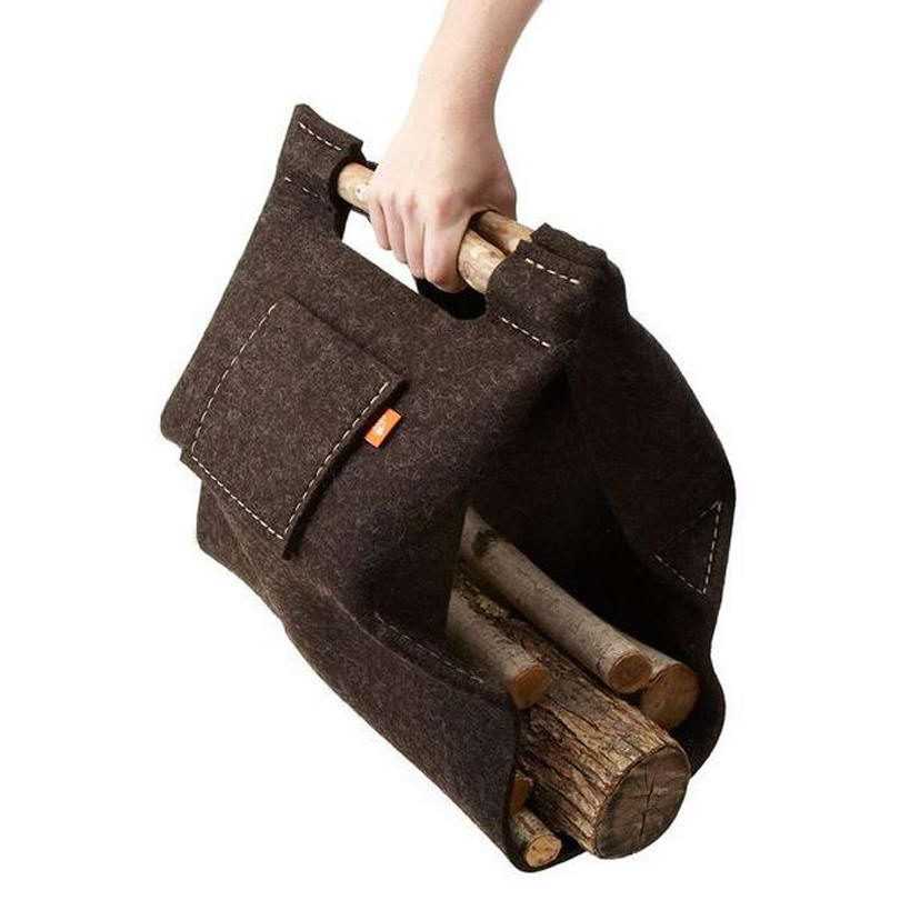 Не спешите выбрасывать старое пальто. Из него можно сделать привлекательную подставку для дров. Внешне она выглядит как сумка. Но имейте в виду, что шерсть загорается достаточно быстро, поэтому держать «одежку для дров» слишком близко к огню не рекомендуется.