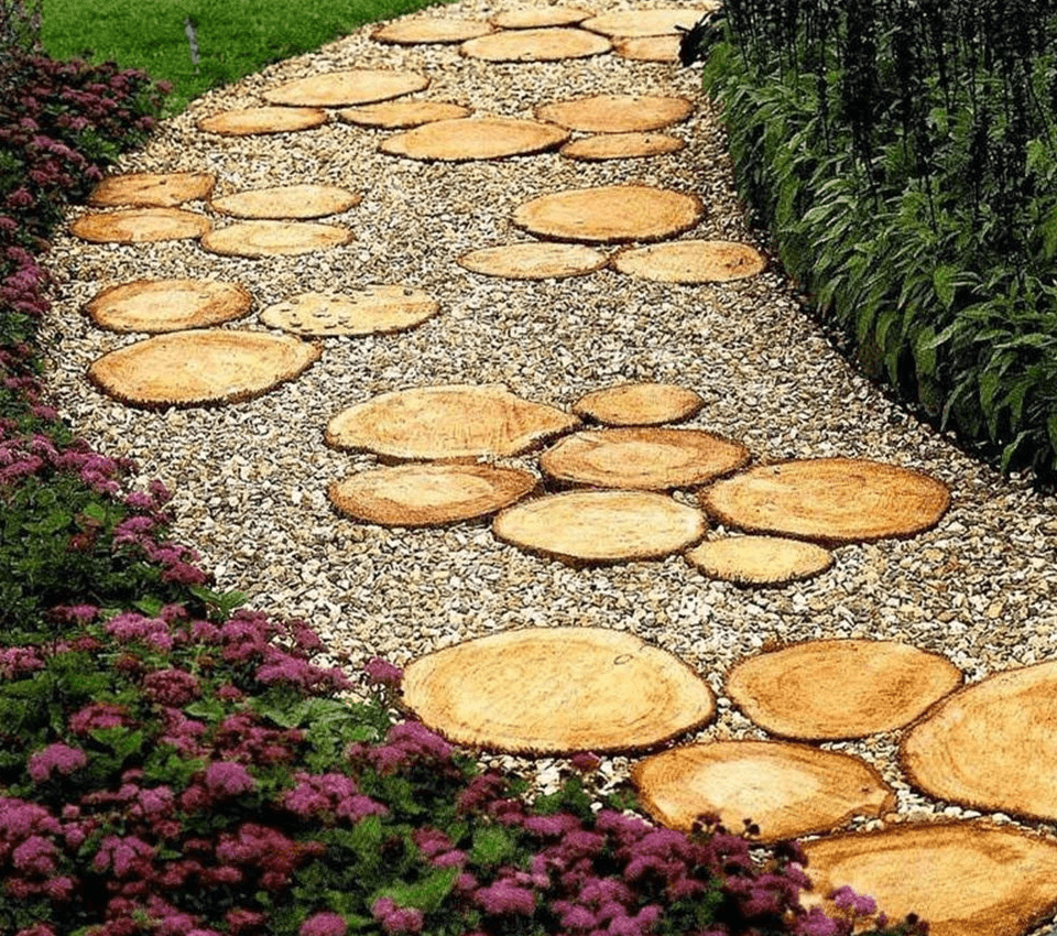 Из деревянных спилов можно выложить великое множество вариантов дорожек. Если ваши спилы крупного размера, то выкладывая один слой за другим, у нас получится чудеснейшее древесное полотно! А пространство между древесиной можно засыпать как гравием, так и грунтом – все зависит от вашей фантазии.