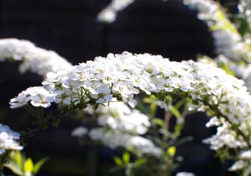 Весенние виды спиреи образуют соцветия преимущественно белого и кремового оттенков. Цветение обычно очень пышное, в это время куст становится похож на белое облако. Благодаря чему весенние спиреи иногда называют майским снегом. Перечислим несколько самых распространенных видов этого типа.