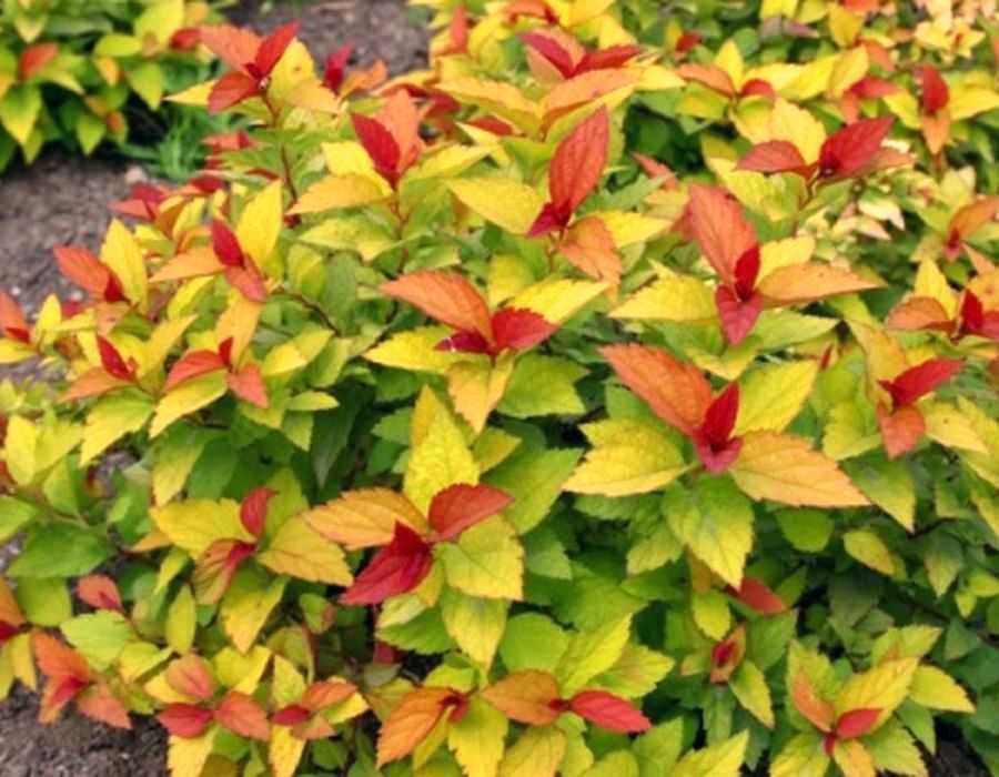 Один из видов вышеописанного сорта, отличается тем, что может вырастать до 1,1 м и имеет желтый цвет листьев. Этот вид спиреи очень эффектный и неприхотливый кустарник высотой до 0,6 — 0,8 метра, диаметром до 1 метра. Декоративен на протяжении всего сезона. Он интересен своими листьями, имеющих бесчисленное количество оттенков оранжевого, красного, желтого, бронзового, золотистого цветов. К июню они становятся ярко-желтыми, потом желто-зелеными на момент цветения. После цветения огненные краски листвы возвращаются. Осенняя окраска листьев потрясающего медно-оранжевого с золотом. Иногда на кусте появляются пестрые листья. Ярко-розовые цветки собраны в зонтики, обильное цветение длится 5о дней.