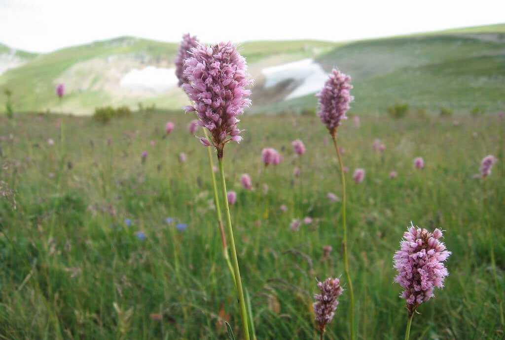 Горец змеиный «Скрученный», вырастает до метра в высоту, стебли переплетаются между собой, образуя, крепкую скрученную форму, листья ланцетные, заостренные. Соцветия цилиндрической формы, крупных размеров, светло-малиновой окраски. Растение широко применяется в фармакологии, почитается цветоводами и является неплохим медоносом.