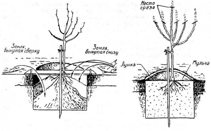 Перед посадкой в яму вбивают деревянный колышек высотой около 140 см. В центре ямы образуют холмик и размещают на нем деревце таким образом, чтобы оно находилось с северной стороны от вбитого колышка. Корешки саженца расправляют по сторонам и присыпают землей.