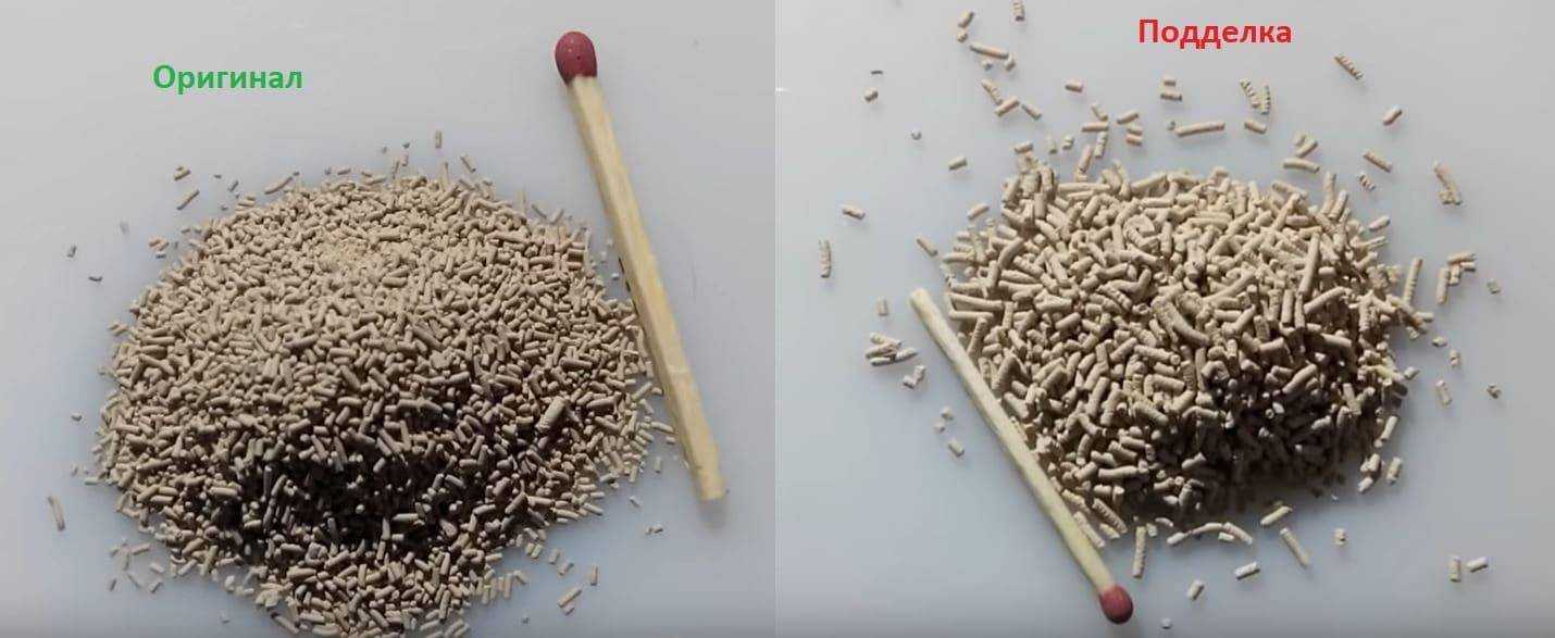 После того, как вы открыли пакетик — осмотрите размер гранул. Оригинальный фунгицид имеет очень мелкие гранулы, у поддельного гранулы более плотные (см. фото ниже):