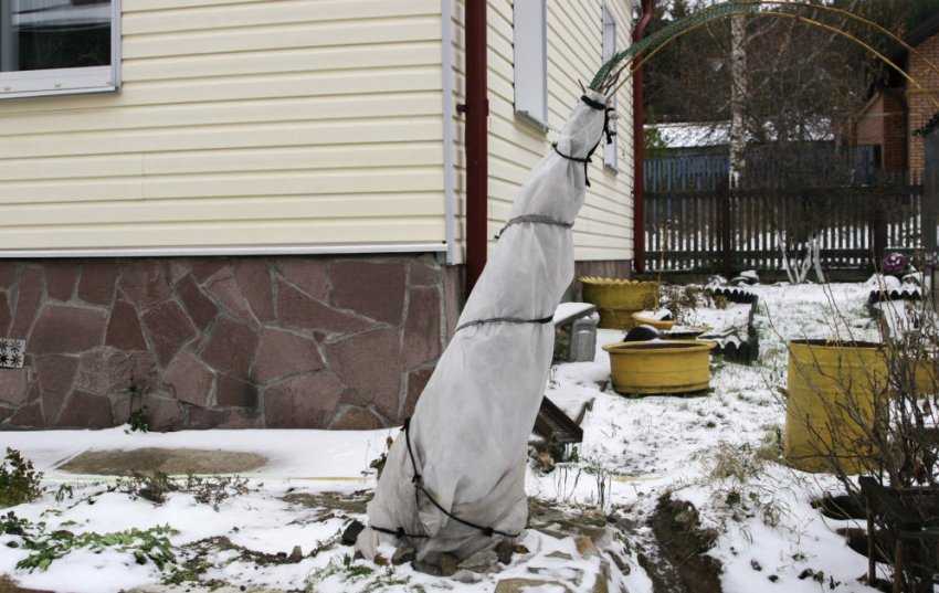 Взрослые кусты с развитыми побегами необходимо обвязать шпагатом или нейлоновой верёвкой. Связанные ветки укутывают спанбондом или агроволокном.
