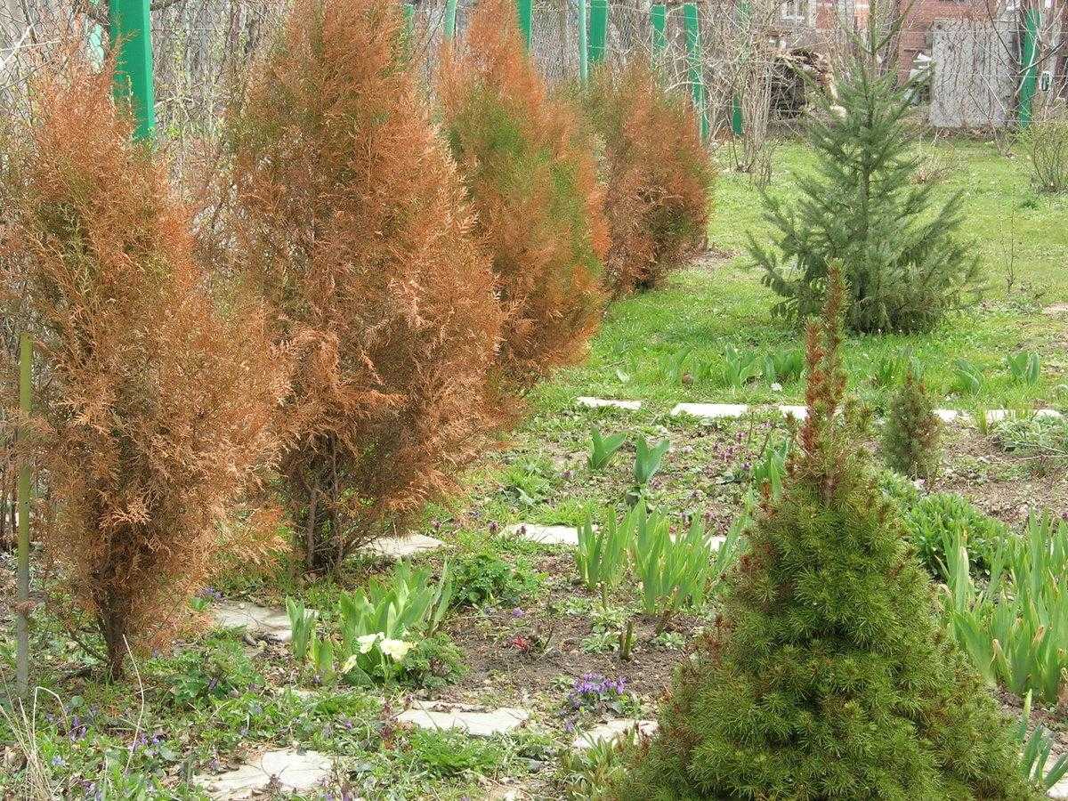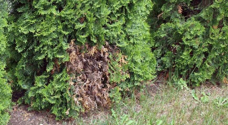 В таких случаях необходимо убирать снег вокруг насаждений туи или укрывать деревья в солнечные дни. Прозрачную полиэтиленовую пленку использовать для укрывания нельзя, так как она пропускает ультрафиолет, который и является причиной ожогов. Высохшие ветви следует удалить, так как их вернуть к жизни уже не получится.