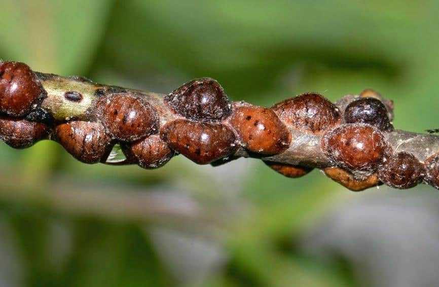 - Паутинный клещ — микроскопическое насекомое. Разглядеть невооруженным глазом практически невозможно. Вредитель сосет сок из юных ветвей, листьев. Активную жизнедеятельность начинает в засушливую погоду, при недостатке влаги. Пораженные деревья сбрасывают листву, засыхают. Определить паутинного клеща можно по тонкой паутине между листьями, гроздями, плоским бляшкам с нижней стороны пластин.