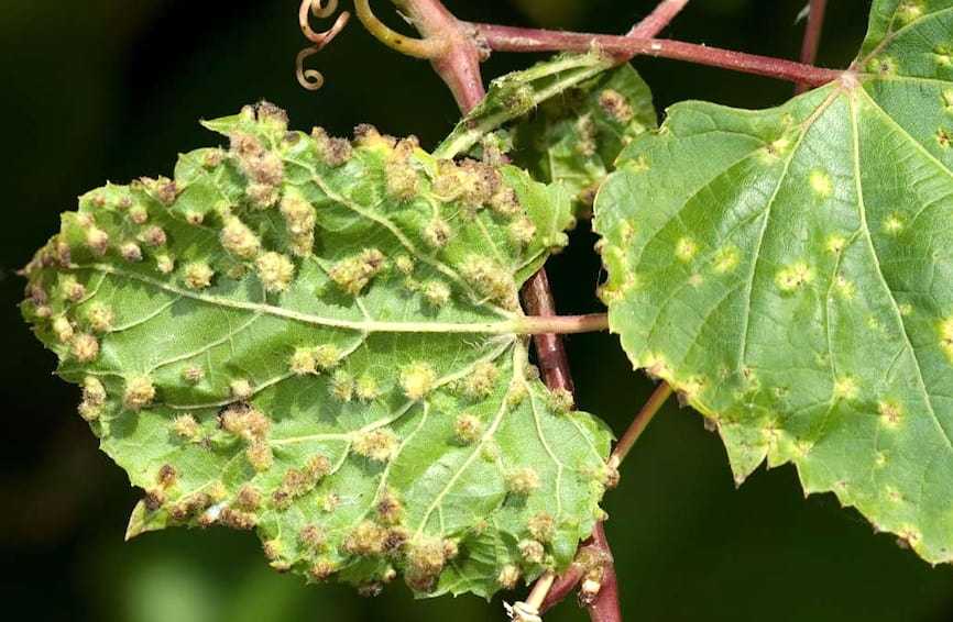Листовая филлоксера — из-за повреждений, наносимых личинками, изнанка листьев покрывается красноватыми или зеленоватыми галлами. На верхней поверхности образуются бурые отметины. Кусты постепенно истощаются | Дважды за период вегетации опрыскивают инсектицидами, применяя «Фастак», «Актеллик» |