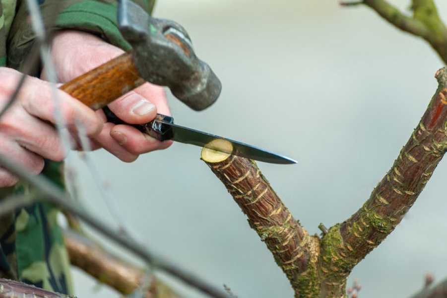 В случае, когда прививка выполняется на скелетную ветку, ее срезают максимально аккуратно и ровно, оставив расстояние до основного ствола около 20 см. После этого в коре выполняют надрез на глубину около 4 см и отделяют ее от древесины.