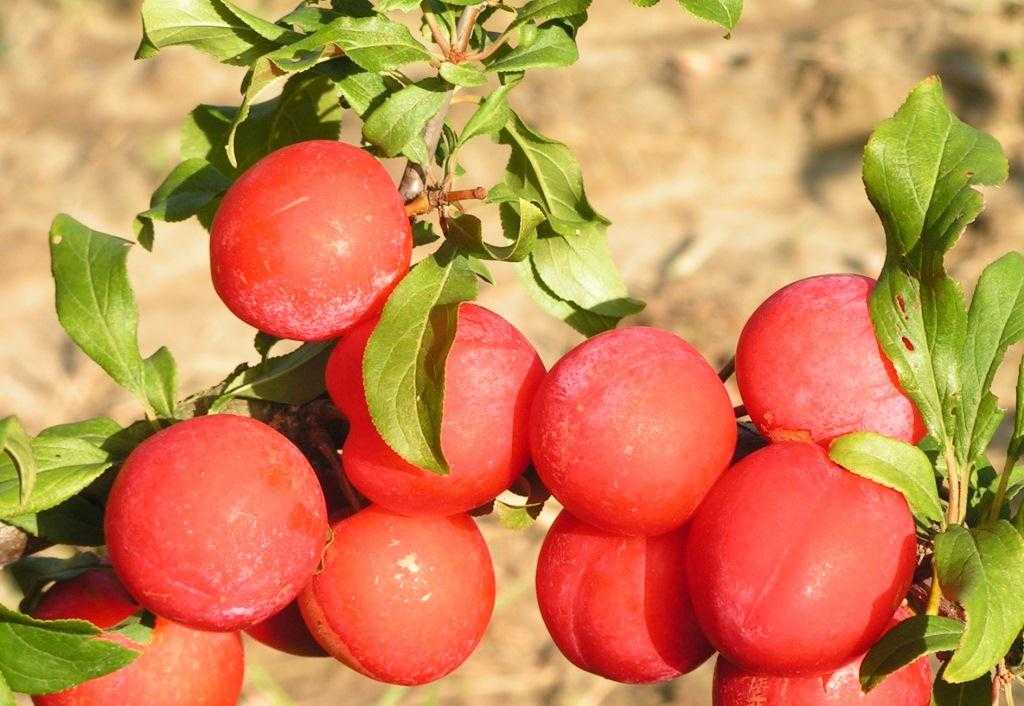 - «Красный шар» – сорт, полученный в Китае. Это дерево очень компактное, небольшое по размеру, растущее до 2,5 метров максимум, но чаще меньше. Крона состоит из раскидистых ветвей, нуждающихся в регулярной обрезке. Листья появляются после цветения. Первые цветы появляются на дереве ранней весной. Они белоснежные, небольшие по размеру. Плоды в среднем по 35-40 г. Кожура красная, плотная, но тонкая, с голубоватым налетом. Мякоть сочная и светлая. Костянка плохо отстает от мякоти, поэтому для переработки он не очень хорошо подходит.