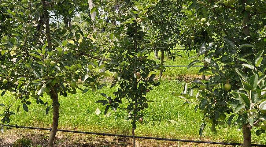 Поливают карликовые яблони каждую неделю по 1 ведру на протяжении всего лета.