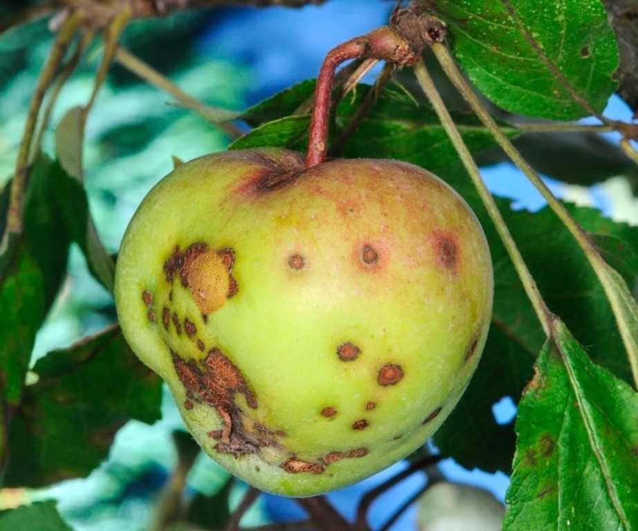 Поражение паршой начинается с появления оливкового налета на листьях, позже на плодах можно увидеть темные пятна и трещины.