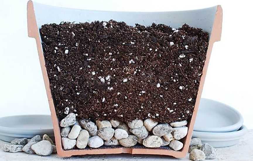 На дно емкости обязательно засыпается слой дренажа, предотвращающего застой влаги в почве. Для этого подойдет песок, прокаленный в духовке или на сковороде, керамзит или мелкая галька.
