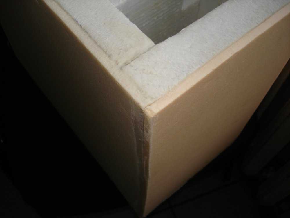 Делаем чертеж необходимого размера ящика и строго по угольнику вырезаем заготовки. Далее наносим на торцы силикон и собираем конструкцию. Пока силикон не затвердел, есть возможность корректировать. После оставляем на сутки для полного схватывания силикона. Далее вырезаем из тонкого пенополистирола внешнюю обшивку и внахлест швов клеим по сторонам на жидкие акриловые гвозди.