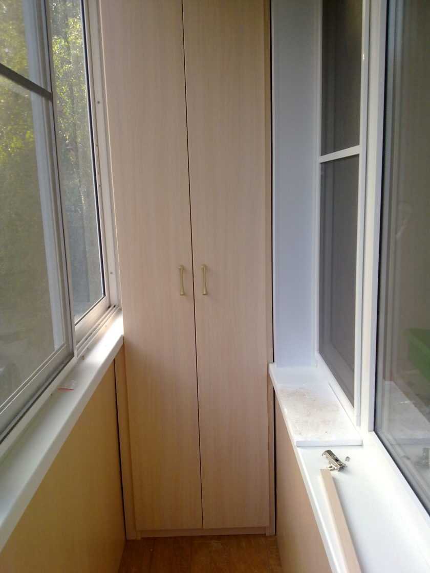 Шкафчик должен быть чуть шире балконной двери, чтобы перекрывать щель между ней и стеной. По высоте лучше подогнать его под подоконник, а глубину сделать таким образом, чтобы вошло несколько рядков банок.