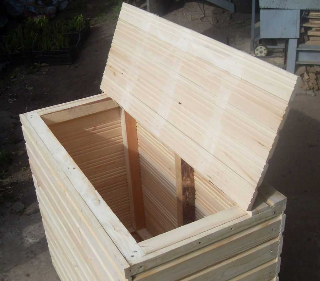 Обшиваем стенки конструкции досками или закрепляем на них пластины, вырезанные из листового материала. Если нужно, ставим перегородку или несколько, чтобы разделить ларь на отсеки.