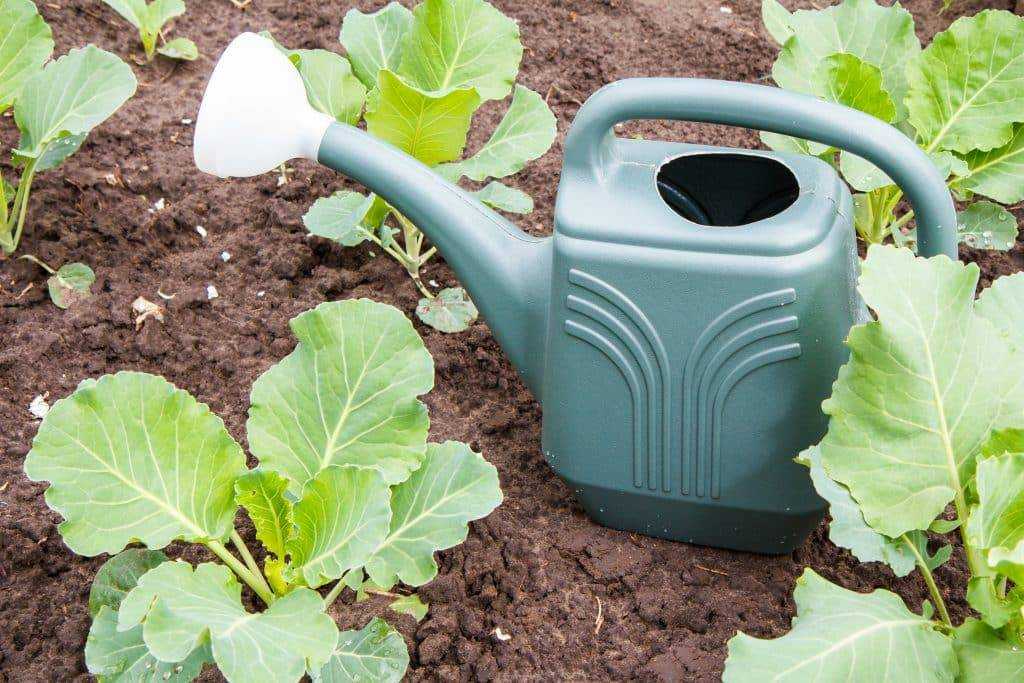 Оптимальное время – утро или вечер. Чем больше листьев формируется за период вегетации, тем больше влаги нужно растению. Далее поливы проводят 1 раз в неделю по 10-15 л на 1м2. За пару недель до начала уборки урожая капусту не поливают вообще.