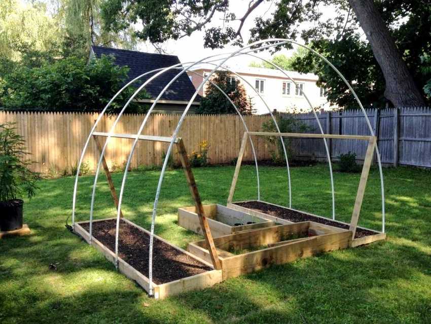 Парник из полипропиленовых труб похож на парник из веток, но в качестве материала в нем используются отслужившие своё ПВХ трубы. Эта конструкция крепче, долговечнее и не боится воды.
