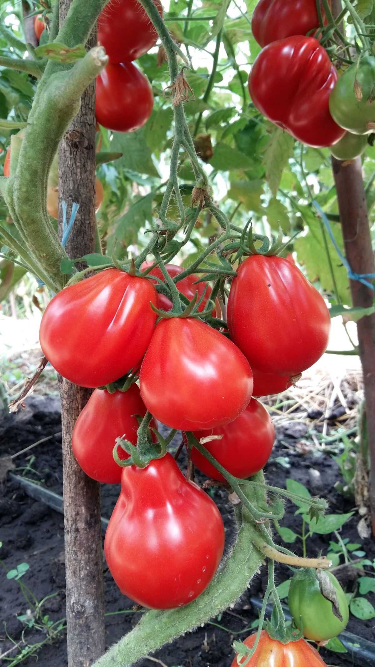 Первое отличие – плоды необычной формы, растущие на невысоких штамбовых кустах. Помидоры заужены в верхней части и расширяются книзу, на манер груши. Вокруг плодоножки ярко выраженная ребристость, внизу плоды гладкие.