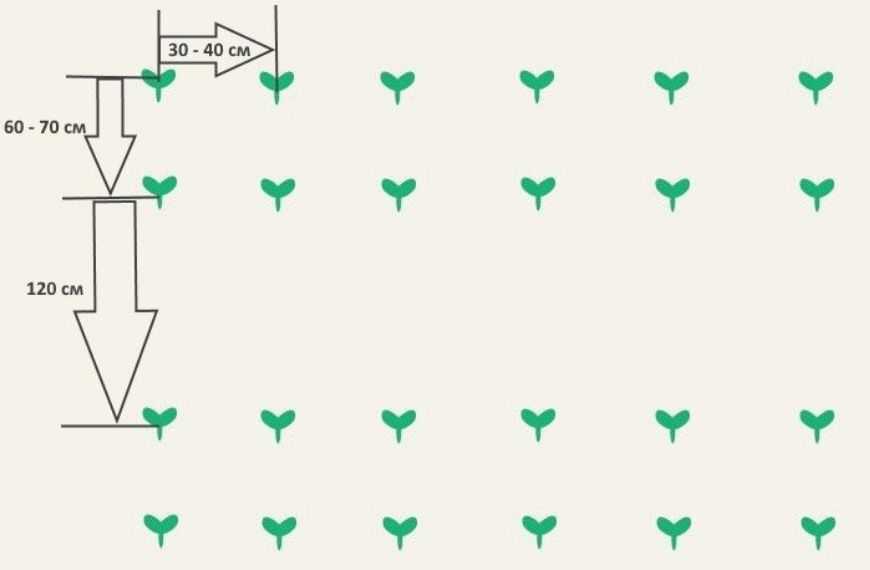 Расстояние между грядками составляет примерно 50 см, а между отдельными ростками — 70-80 см. Эта схема обеспечивает полноценный рост, кустики не будут мешать друг другу хорошо развиваться.