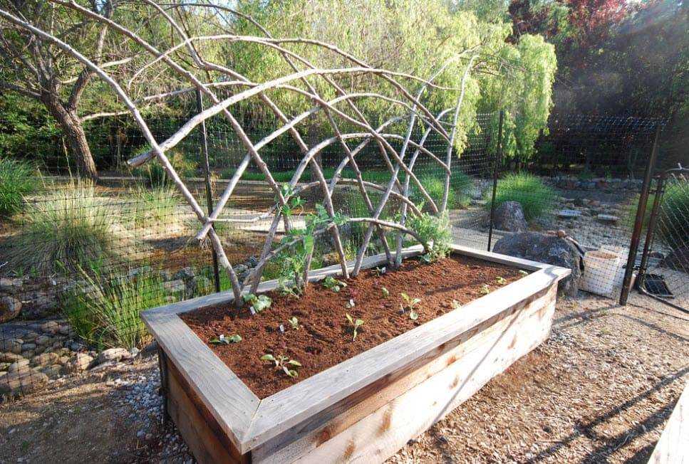 Лоза и прутья – недорогое и оригинальное решение. Плетеные стенки выглядят очень привлекательно, можно придать грядке любую форму. Недостатки: плетение лозы требует навыков, срок службы такого каркаса очень короткий.